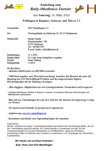 Am 30. März 2025 fand beim HSV Mainflingen e.V. die traditionelle Frühjahrsprüfung im Turnierhundesport statt. Unter der Turnierleitung von Maren Kallnik und der Bewertung durch Leistungsrichterin Bianka Schmitt trafen sich zahlreiche Hundesportlerinnen und Hundesportler zu einem sportlich erfolgreichen Tag auf dem Vereinsgelände.... weiterlesen