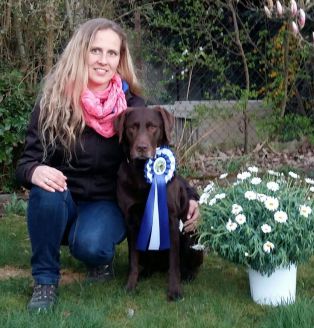 Zuerst trat Jenny Disser mit ihrer Labrador Retriever Hündin „Aiméé“ an. Es war eine reine Freude den Beiden bei der Arbeit zuzusehen. Ob die Fußarbeit, das Schicken in die Box oder die Distanzkontrolle, alles vorzüglich, nur bei der Apport war die Hündin etwas verspielt dabei. Aber das ist Jammern auf hohem Niveau den 300 von 320 Punkten ist einfach eine Hammerleistung und wurde mit dem Titel Kreismeisterin Klasse Beginner belohnt.