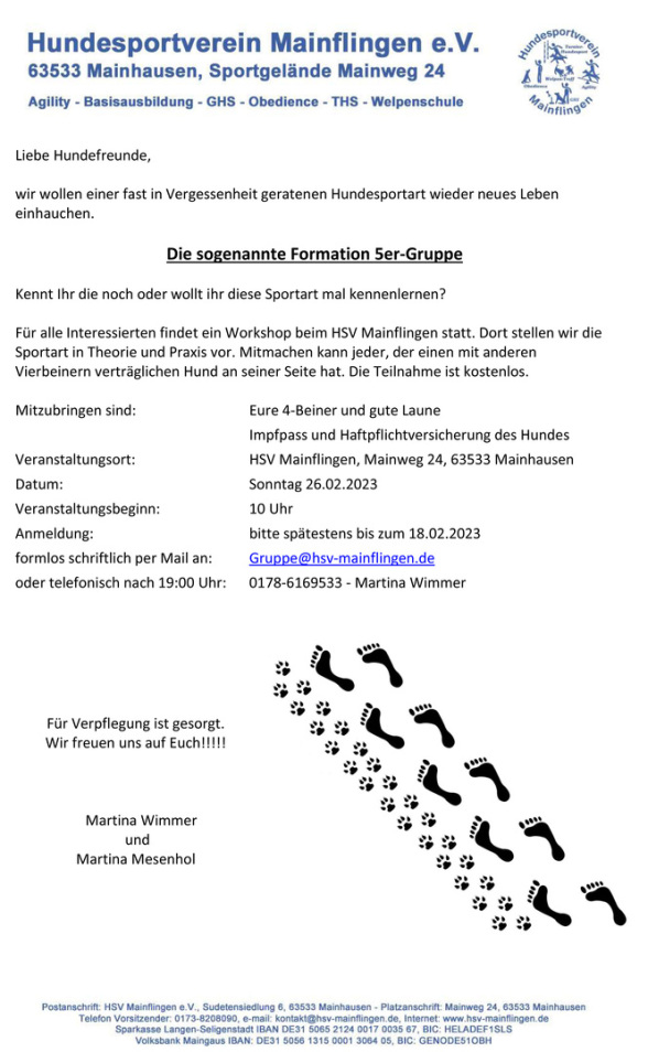„Wir wollen einer fast in Vergessenheit geratenen Hundesportart wieder neues Leben einhauchen - Die sogenannte Formation 5er-Gruppe - Kennt Ihr die noch, oder wollt ihr diese Sportart mal kennenlernen?“,