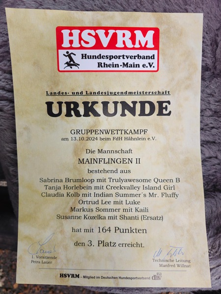 Am 13. Oktober 2024 fand in Alsbach-Hähnlein die Landesmeisterschaft im Gruppenwettkampf des Hundesports statt. Der HSV Mainflingen war mit zwei Teams erfolgreich vertreten und konnte sich starke Platzierungen sichern. Die Leistung der Teams wurde von Leistungsrichter Norbert Franzel bewertet, der auf faire und präzise Entscheidungen achtete und den Wettbewerb auf hohem Niveau begleitete.